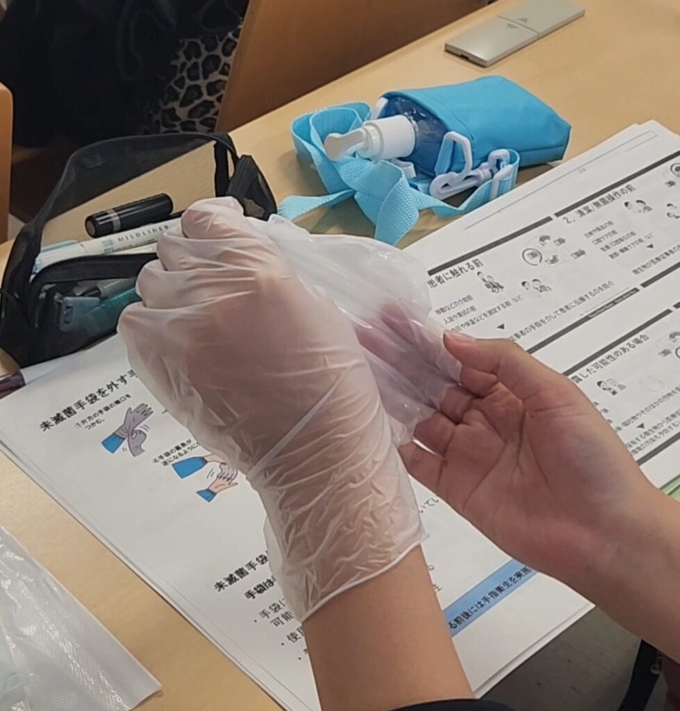 他にもエプロン、マスク、手袋の着脱方法や順番を教えてもらい、実践!!