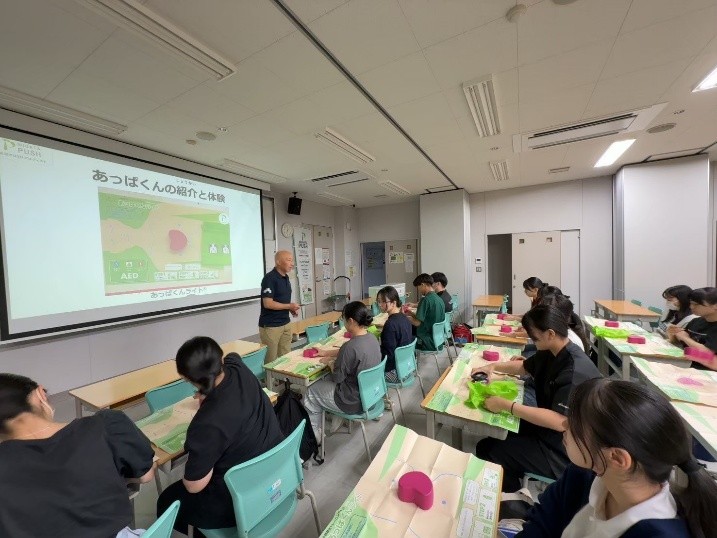 胸骨圧迫の練習用人形「あっぱくくん」を使って、正しい押し方を実際に体験できます。